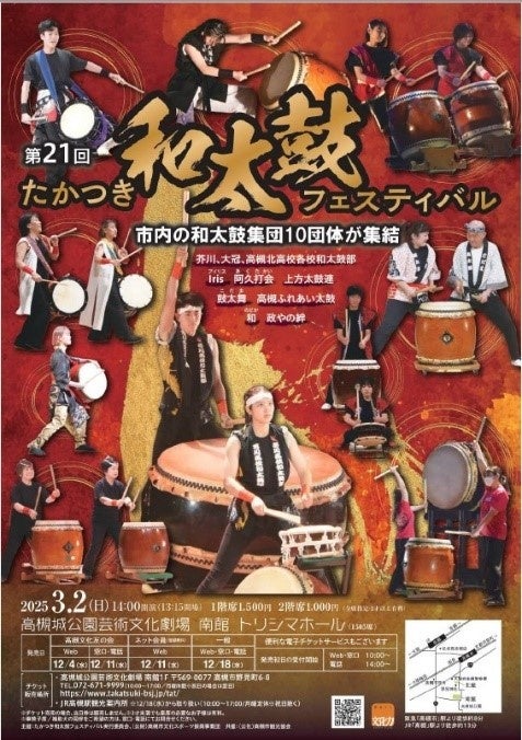 令和7年3月2日(日曜日)、高校和太鼓部や和太鼓サークルなど高槻市内で活動する10団体が出演する「第21回和太鼓フェスティバル」が高槻城公園芸術文化劇場で開催。ぜひ、和太鼓の力強さと躍動感をお楽しみください。