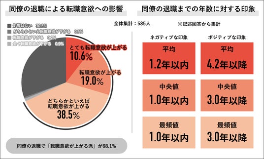 ・全体の68.1%が同僚の退職で「転職意欲が上がる」 ポジティブな印象を持つ同僚の退職平均年数は4.2年