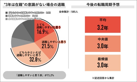 回答者全体の585人に"3年は在籍した方が良い"という意識がない場合の退職のしやすさを聞くと、「退職しやすいと思う派」が71.2%で、内訳は「とても退職しやすいと思う」16.9%、「退職しやすいと思う」21.5%、「どちらかといえば退職しやすいと思う」32.8%でした。また、今後の転職周期予想を聞くと、平均が3.2年、中央値が3.0年、最頻値が3.0年となりました。