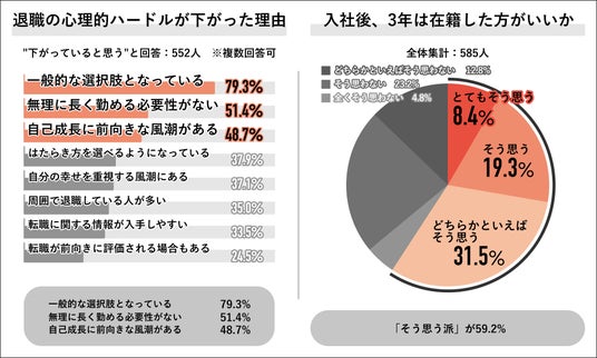 退職への心理的ハードルが下がっていると回答した552人にその理由を聞くと、「一般的な選択肢となっている」が79.3%で最多となり、次いで「無理に長く勤める必要性がない」が51.4%、「自己成長に前向きな風潮がある」が48.7%となりました。また、回答者全体の585人に、入社後3年は在籍した方がいいかを聞くと、「そう思う派」が59.2%と過半数を占め、「とてもそう思う」が8.4%、「そう思う」が19.3%、「どちらかといえばそう思う」が31.5%となりました。