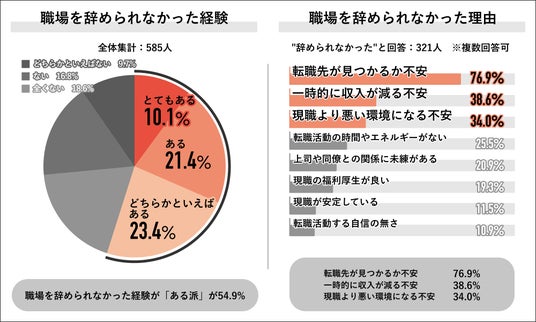 回答者全体の585人に、職場を辞めようと思っても辞められなかった経験を聞くと、「ある派」が54.9%で過半数を占め、内訳は「とてもある」10.1%、「ある」21.4%、「どちらかといえばある」23.4%でした。辞められなかった経験ありと回答した321人にその理由を聞くと、「転職先が見つかるか不安」が76.9%で最多となり、次いで「一時的に収入が減る不安」が38.6%、「現職より悪い環境になる不安」が34.0%となりました。