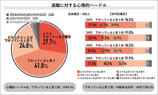 回答者全体の585人に、退職に対する心理的ハードルを聞くと、「下がっていると思う派」が94.3%で過半数を占め、内訳は「とても下がっていると思う」27.7%、「下がっていると思う」41.8%、「どちらかといえば下がっていると思う」24.8%でした。「下がっていると思う派」の年代別では、20代と40代が96.5%、50代が91.9%、30代は91.0%となりました。