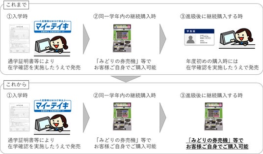 通学証明書等の確認が不要となり、卒業まで「みどりの券売機」等にてお客様ご自身で通学定期乗車券をご購入いただけるようになります。