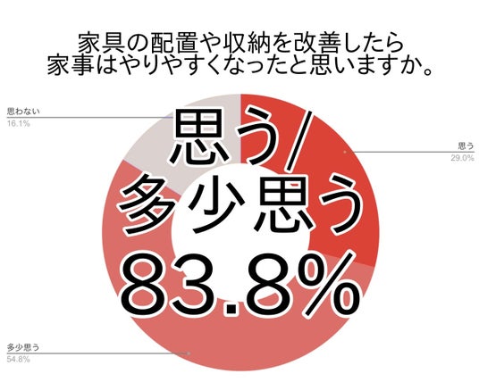 今回のアンケートでは、家具の配置や収納を改善したら家事はやりやすくなったと思う・多少思うと答えた方は約8割(関東83.8%・全国83.0%)でした。