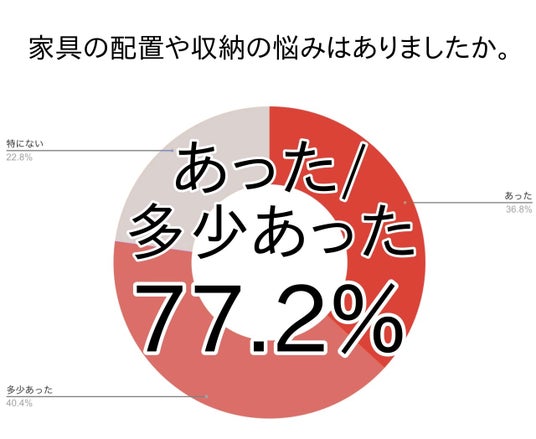 今回のアンケートでは、家具の配置や収納の悩みがあった・多少あったと答えた方は7割台(関東77.2%・全国73.2%)でした。