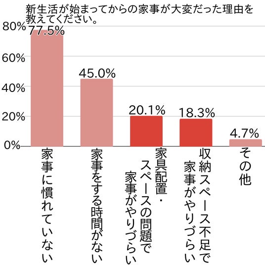 アンケート(関東)では、新生活が始まってからの家事に大変さを感じていた方は約8割で、家事に慣れない・忙しく時間がないことに加え、生活スペース・収納スペース不足や使い勝手の悪さが家事効率ダウンにつながっていることがわかりました。