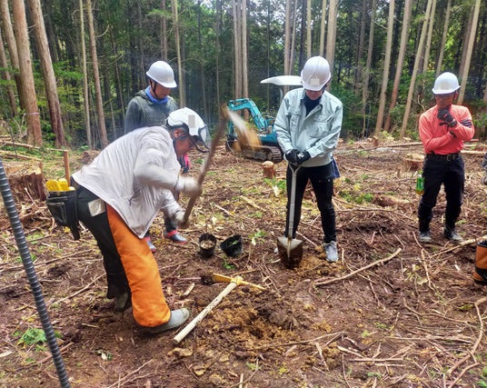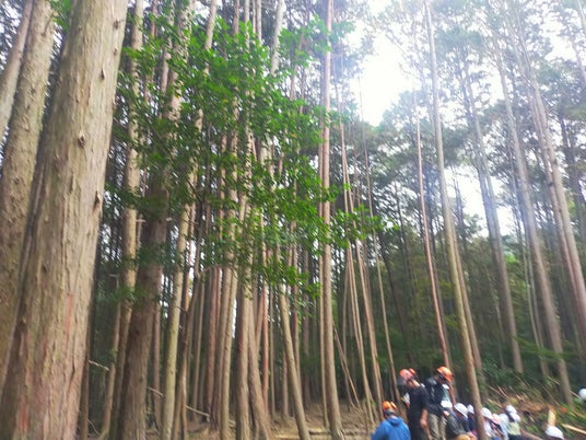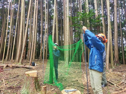 このイベントでは、ヒノキなどの人工林を伐採し道を通し、里山林をつくっています。