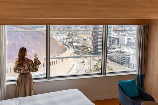 ご宿泊いただく客室は、福岡ソフトバンクホークスの本拠地・みずほPayPayドーム福岡側の眺望をお約束※5。17~29階の高層フロアに位置する「ツインヒルトン高層フロア」や「ツインプレミアムデラックス」からは、ドームを中心に、海・空・福岡の街並みを一望する雄大なパノラマをお楽しみいただけます。
