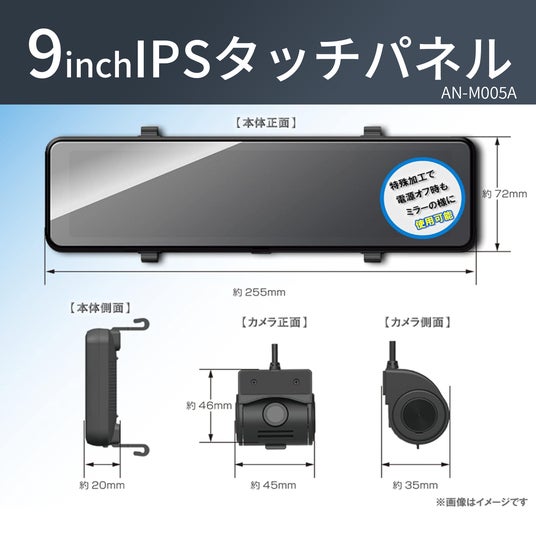 サイズ :約255(W)x72(H)x20(D)mm(ミラー本体)/約45(W)x46(H)x35(D)mm(リアカメラ体)