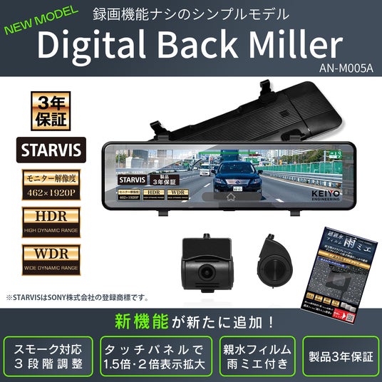 株式会社慶洋エンジニアリング(東京都港区新橋)は進化したAN-M005A、スモーク機能・製品3年保証・超親水フィルム「雨ミエ」付きで、後方の視界をクリアにするデジタルバックミラーを発売致します。
