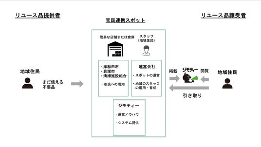 まだ使える家具・家電・子供用品・レジャー用品・衣類・食器・本等の持ち込みが可能となっており、集まったモノは、ジモティースポットに訪れるだけで購入し引き取ることができます。ジモティースポット岸和田・貝塚では不要品を持ち込む際の事前予約は不要です。詳しい利用方法については、以下のURLをご参照ください。なお、ジモティースポット岸和田・貝塚は、岸和田市でイベントの企画・制作・運営を行う株式会社イベントレインの協力のもと運営します。