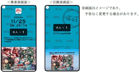 現在発売しているデジタル1日乗車券の運賃(大人:600円、小児:300円)と乗車可能区間(一般路線全路線)を据置きで、券面を『劇場版 忍たま乱太郎 ドクタケ忍者隊最強の軍師』とコラボした特別仕様に変更します。乗車券は阪急阪神ホールディングス株式会社が提供するスマートフォン向けアプリ「HH cross TOWNS」からご購入いただけます。また、乗車券には(2)のオリジナルコラボ路線図のプレゼントに必要な引換券が付いています。