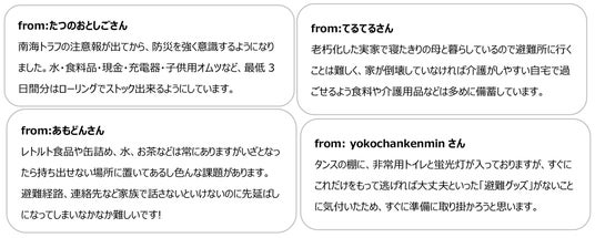 本コミュニティでは既に防災のアイデア、災害への不安や防災対策にまつわる悩みについて、活発にコミュニケーションが交わされています。ユーザーから寄せられたコメントの一部を紹介します。