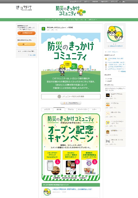 オープンを記念して、本コミュニティに登録後、キャンペーン期間中にコミュニティ内で1回以上コメントを投稿し、応募フォームに入力した人を対象に、防災に役立つグッズが計25人に当たるキャンペーンを実施します。締め切りは2月28日(金)午後1時。コミュニティへの参加は無料です。