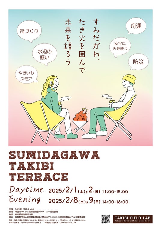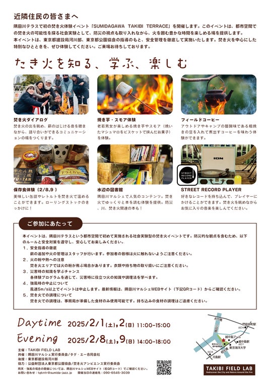 隅田川テラスで初の焚き火体験イベント「SUMIDAGAWA TAKIBI TERRACE」を開催します。このイベントは、都市空間での焚き火の可能性を探る社会実験として、防災の視点も取り入れながら、火を囲む豊かな時間を楽しめる場を提供します。