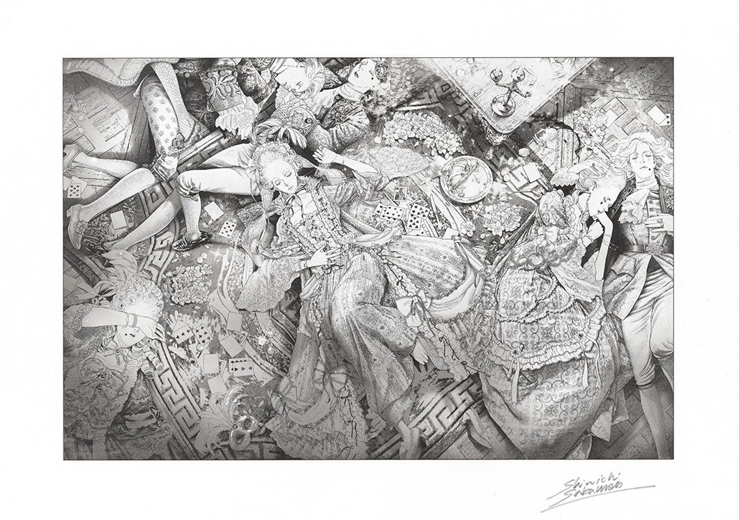 この作品の中から、ベルサイユ宮殿でパーティーに明け暮れ、貴族たちと床で眠り込むマリー・アントワネットを描いたシーンを選び、コロタイププリントにより作品化しました。