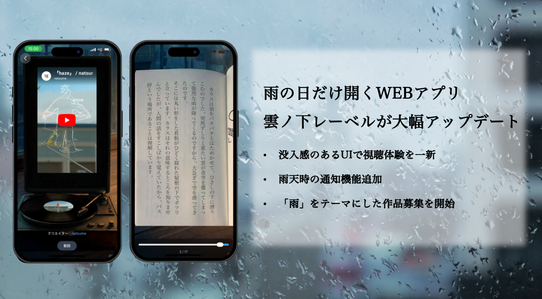 アップデートに合わせ、アーティスト・natsume氏による書き下ろしの新作楽曲を公開します。雨の日にだけ聴くことのできる本作は、雲ノ下レーベルのコンセプトである「気象と感情の詩的体験」をさらに深める一曲です。新しいレコードプレーヤー風UIとともに、作品世界を存分にお楽しみください。