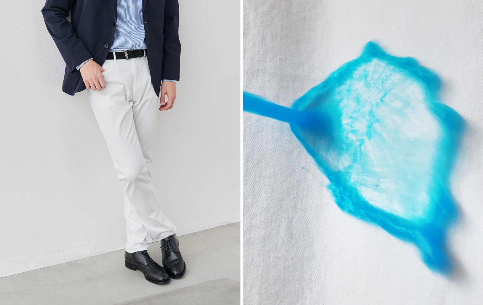 また、生地ではなく「製品加工」──縫い上がったパンツを職人が手作業で溶剤に漬け込む方法を採用。コットン本来の柔らかな風合いを損なうことなく、縫い目・針穴の隙間まで撥水剤が行き渡ります。