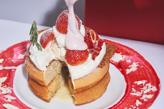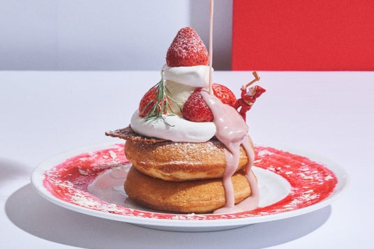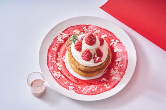 まるで苺ショートのホールケーキ...!口の中でふわっととろけるエアリーなチーズクリームが、いちごの甘酸っぱさとぴったりです。香り豊かな発酵バターがパンケーキにじゅわっと染み込み、アーモンドチュイルのカリっとした食感と香ばしさが全体のアクセントに。