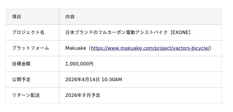 合同会社Rico(本社:滋賀)は、日本発のフルカーボン電動グラベルバイクVACTORS「EX ONE」を、2026年4月14日(火)10:30より応援購入サービス「Makuake」にて先行公開いたします。