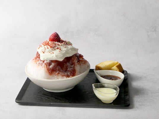 さらに味の変化を楽しんでいただくため、練乳や黒蜜、小豆、生はちみつなど、それぞれのお味に合わせて付け合わせます。お箸休めにはシフォンケーキ、パウンドケーキ、みたらし団子、杏仁豆腐もご用意いたします。