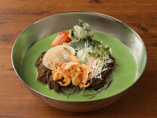 韓国冷麺独特の「トトリ麺(韓国語で「どんぐり」を意味する「トトリ」の粉を生地に練りこんだ冷麺のこと)」と一緒に、春の訪れを視覚と味覚でお楽しみください。