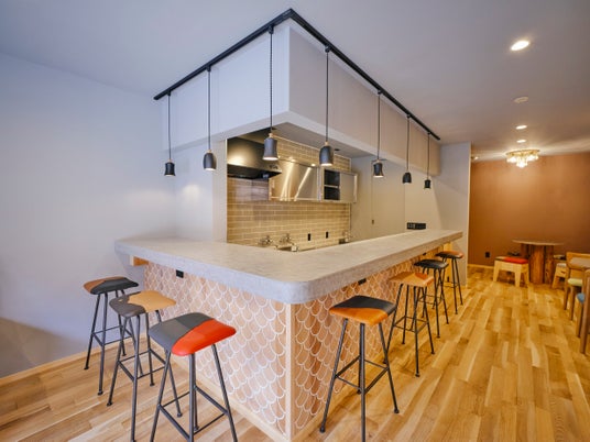 また、元のスナック富乃家さんの名残を一部残すため、シャンデリアとオレンジ色のガラス壁を再利用いたしました。
