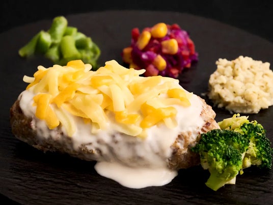 チーズ好きはもちろん、リッチな味わいを求める方にもオススメの一品です。たっぷりのチーズを包み込んだふっくらジューシーな牛肉メインのハンバーグの上に、さらにチーズをトッピング。冷めてもとろけるホワイトソースが贅沢な味わいをキープし、食べるたびにチーズの濃厚さと肉の旨味が広がります。