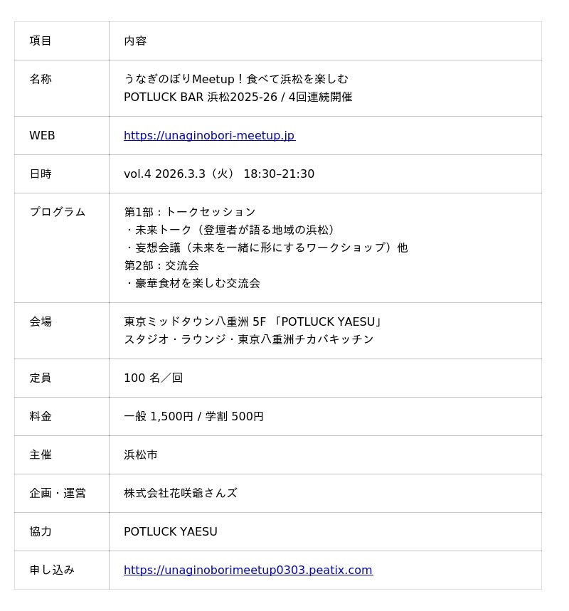 浜松市観光・シティプロモーション課は、2026年3月3日(火)、東京ミッドタウン八重洲にて、今年度の集大成となる交流イベント「うなぎのぼりMEETUP Vol.4 ~大感謝祭~」を開催します。