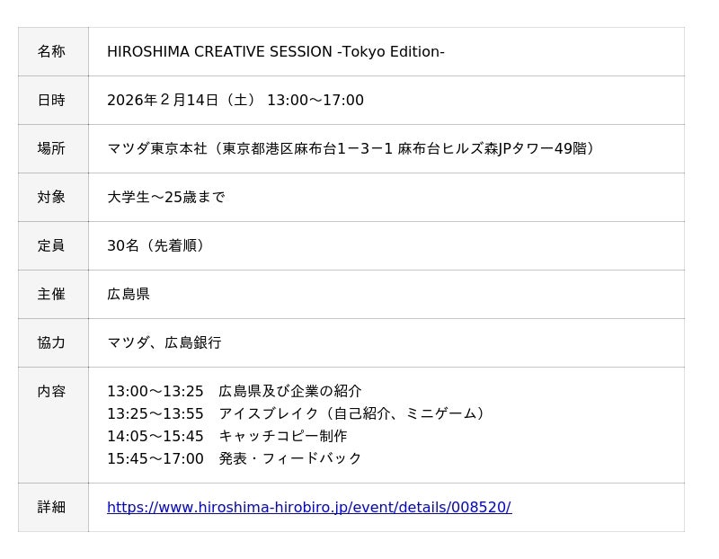 首都圏の若者(大学生~25歳まで)を対象に、マツダ株式会社(以下「マツダ」という。)と株式会社広島銀行(以下「広島銀行」という。)の協力を得て、共創型ワークショップを2月14日(土)にマツダ東京本社で開催します(参加無料)。