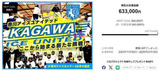 香川アイスユナイテッドのクラウドファンディング『ここから始まる新たな挑戦!#香川アイスホッケー58年の歴史』、目標を126%達成して終了