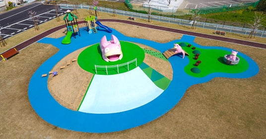 ことでん綾川駅から徒歩5分の場所にある、あちこちでヤドンを感じられるヤドンファンにはたまらない公園。 障がいのある子もない子もいっしょに楽しめるインクルーシブ遊具(「オムニスピナー」や「サポート付きブランコ」など)を設置しています。