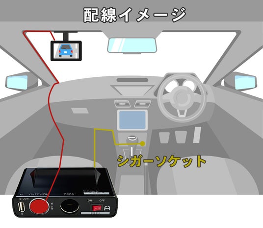 本製品をドライブレコーダーと車両の間に設置すると走行中に充電して、エンジンを切ると充電した内蔵バッテリーでドライブレコーダーを動かします。