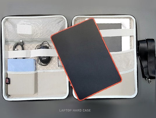 中に仕切りとしてマウスパッドがパソコンの傷を最小限に持ち運びます。
