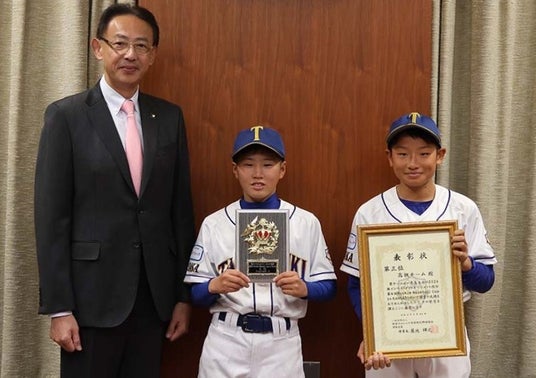 中学1年生のルーキーを対象とした大会に臨むメンバーの中、篠原さんはキャプテン、小林さんは背番号1のエースピッチャーとしてチームの主力を担い、8月に行われた関西地区大会で、全76チーム中第3位を獲得。12月25日から28日まで沖縄県で行われる全国大会「JAL沖縄第4回Rookie Baseball Cup」への切符を手にしました。この日、市役所を訪れた2人は、全国大会に向け「チームの目標としている全国制覇を目指して頑張ります」と意気込みを話し、濱田市長は「全国大会出場は、本市にとっても大変名誉なことです。ベストを尽くして頑張ってください」と激励しました。