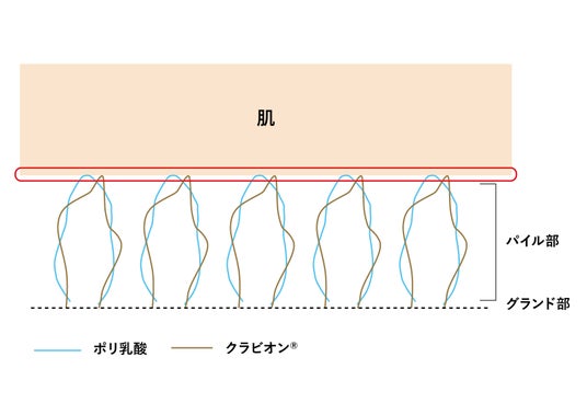 2つの特徴を持つ糸を撚り合わせ、パイルをループ状に立たせることで空気を含みやすくして泡立ちを良くしています。また、「面」ではなく「点」で肌に触れるように立体的に編み上げることで、刺激が少ないやさしい肌ざわりを実現しました。