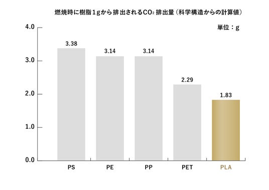 また、ポリ乳酸(PLA)の燃焼時に排出されるCO2量は、数あるプラスチックの中でも最低レベル。さらに、原料である植物が成長する際に大気中からCO2を吸収するので、PLAは他のプラスチックに比べて地球温暖化の原因と考えられるCO2の排出量を大幅に削減します。また、燃焼熱は、石油系プラスチックの1/2~1/3と低く、もちろん焼却時に有毒ガス(ダイオキシン、塩化水素、NOx、SOx)は排出しません。