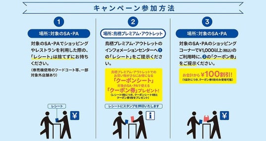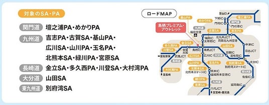 対象のサービスエリア(SA)・パーキングエリア(PA)でお買い物のうえ、鳥栖プレミアム・アウトレットへお出かけいただくとお得なクーポンをプレゼント、お帰り時も対象SA・PA でのお買い物がお得になるキャンペーンです。