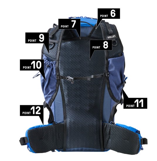 11:一時的にトレッキングポールを固定可能なショルダー、ヒップベルトループ