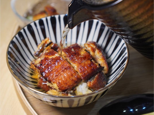 出汁をかけて:最後に、特製の出汁をかけて、お茶漬け風にさっぱりとお召し上がりください。重厚感のある鰻の味わいが、出汁によって軽やかになり、まったく違った楽しみ方が広がります。