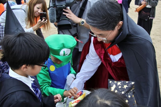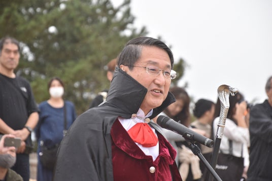 鳥取砂丘では、仮装姿の約350人が集結する初のハロウィンパーティーが開幕しました。セレモニーには「サキュウ血鬼(さきゅうけつき)」に扮した平井県知事が登場。「県内いろいろなハロウィンイベントをしていますが、ここ鳥取砂丘は大自然の中で安全にパレードができる場所です。全国の皆さん、ハロウィンは鳥取砂丘に早急(さっきゅう)に来て下さい!」とコメントし、祭典のはじまりを盛り上げました。
