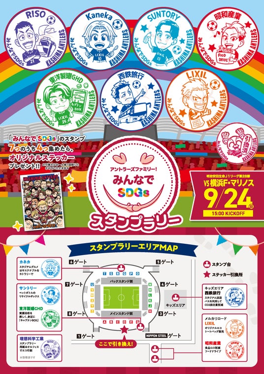 「アントラーズファミリーみんなでSDGs」に参加する各パートナー企業の4つの特設ブースにあるスタンプをすべて集めて、スタジアム場外NIPPON STEELゲート付近の特設ブースで提示いただいた方には、千田純生先生による所属全選手のイラストが描かれた特製のオリジナルステッカーをプレゼントします。
