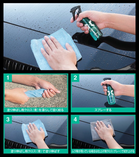 本製品の作業はスプレーして拭き上げるだけ。高濃度処方で伸びやすく、1本で中型車約6~7台分を施工可能(ボンネットの面積で約1~3スプレーが適量)。クルマは乾いた状態でも、濡れた状態でも使用できます。