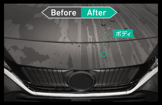 本製品を施工すると、表面にレジン被膜が形成され、強力な撥水効果と深みのある艶をクルマに付与します。