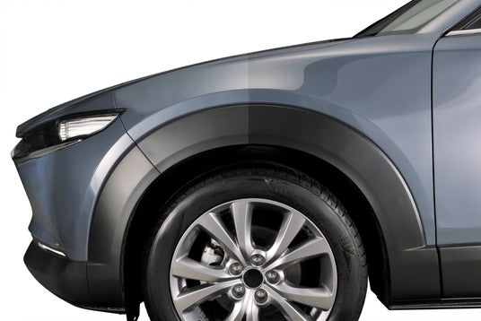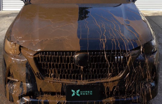 当社は近年人気のSUVには黒樹脂パーツの面積が広いクルマが多いことに着目し、2020年よりボディと黒樹脂パーツの両方に効果を発揮するコーティング剤の開発に着手しました。そしてこの度、高い撥水性と艶が特徴のオイル系レジンを採用。当社独自の水を含まない高濃度処方(特許出願済み)にすることで、ボディの艶が深まり、雨や汚れを強力に弾く「ハイパーレジン」の製品化に至りました。黒樹脂部分にも充分な撥水効果と艶感を発揮するため、本製品1つでボディと黒樹脂パーツをまとめて施工可能です。