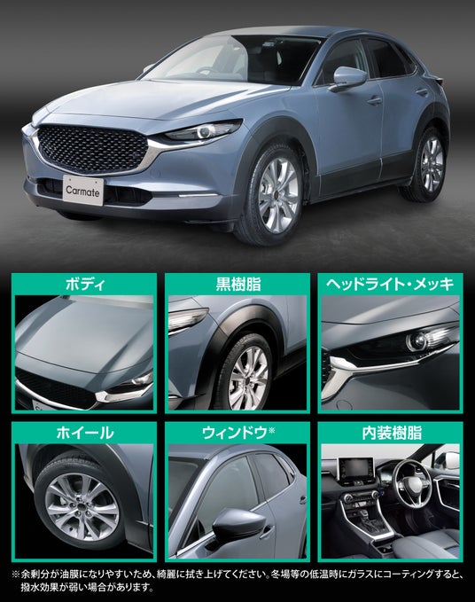 黒樹脂パーツが多いSUVに最適。ボディに深い艶を与え、黒樹脂の黒さを際立たせるオイル系ボディコーティングを発売