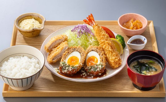 創業67周年の感謝を込めて、今年もさらに内容を充実させた『贅沢ミックスフライ定食』を販売いたします。今年のメインは、濃厚なデミグラスソースで味わうスコッチエッグ。特大の海老フライや、柔らかく上品な味わいの豚ヒレかつなど、特別感あふれる“ごちそう定食”です。
