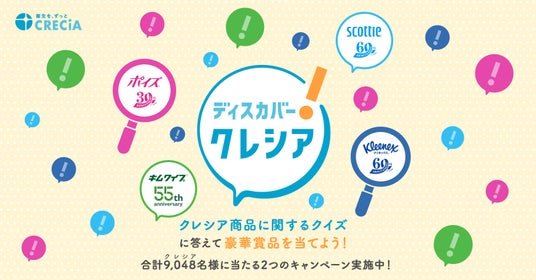 今では日常に欠かせないティシューを日本で初めて発売した日本製紙グループの日本製紙クレシア株式会社〔住所:東京都千代田区神田駿河台4-6、代表取締役社長:安永敦美〕は「ディスカバー!クレシアキャンペーン」を2024年11月1日より開催いたします。2021年11月にコーポレートスローガン「衛生を、ずっと」を制定して3周年。また、4つのブランド(クリネックス・スコッティ・ポイズ・キムワイプ)の商品がそれぞれの周年アニバーサリーを迎える節目の年に、「クレシア」をより知っていただきたいとの想いを込めて、「ディスカバー!クレシアキャンペーン」と題したWEBキャンペーン「クレシア、見つけた!」とXキャンペーン「クレシアイ検定」を同時開催いたします。社名の「クレシア」にちなんで、合計9048名様に豪華賞品が当たります。