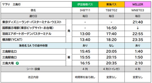 ・利用方法:「東京ディズニーランド(R)」・国際展示場駅・羽田空港・横浜駅発 ⇒三島行 の便を予約サイト「WILLER TRAVEL」(https://travel.willer.co.jp/bus/airport-bus/mishima-haneda/)で事前予約・決済