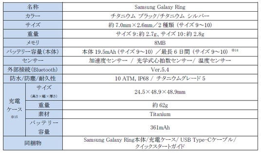 <主な仕様:「Samsung Galaxy Ring」>